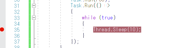 ではVisual Studioでこのexeをデバッグしてみます。とその前に、スレッド一覧を見るにはブレークポイントを仕掛ける必要があります。デッドロック箇所の見当がついていればいいですが、そうでないときは以下のように「Thread.Sleepするだけのスレッド」を作ってそこにブレークポイントを仕掛けましょう。