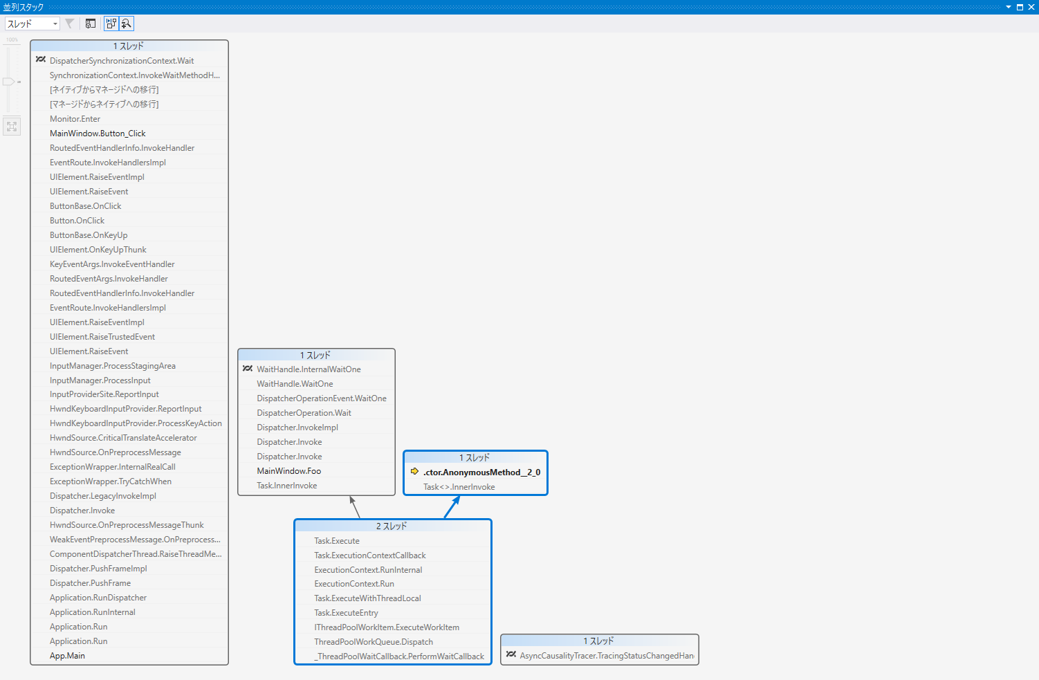 exeを起動し、ボタンを連打してデッドロック状態にします。次に、「デバッグ」→「プロセスにアタッチ」から当該のexeを選択します。ブレークポイントが適切に設定できていれば、そこを通った瞬間にプロセスの動作が止まり、「デバッグ」→「ウィンドウ」→「並列スタック」からスレッドの一覧を見ることができます。
